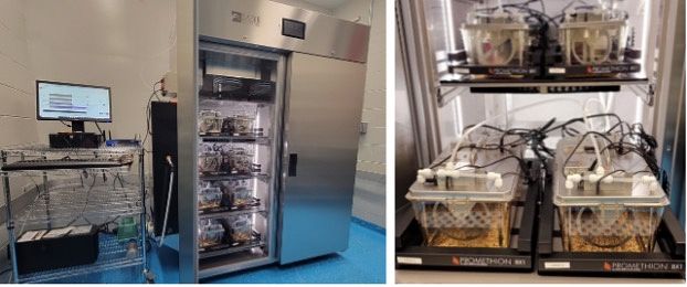 Whole-animal metabolic phenotyping is conducted using the Sable Systems Promethion Core metabolic phenotyping system. This system provides continuous, high-resolution measurements of oxygen consumption (VO₂), carbon dioxide production (VCO₂), respiratory exchange ratio (RER), energy expenditure, food and water intake, locomotor activity, and circadian behavior in rodent models. Integrated voluntary running wheels and stable isotope–capable gas analysis allow longitudinal assessment of metabolic adaptations under physiologically relevant conditions. This system is housed within an environmental control cabinet, which allows for user manipulation of light exposure (timing and intensity) and temperature.